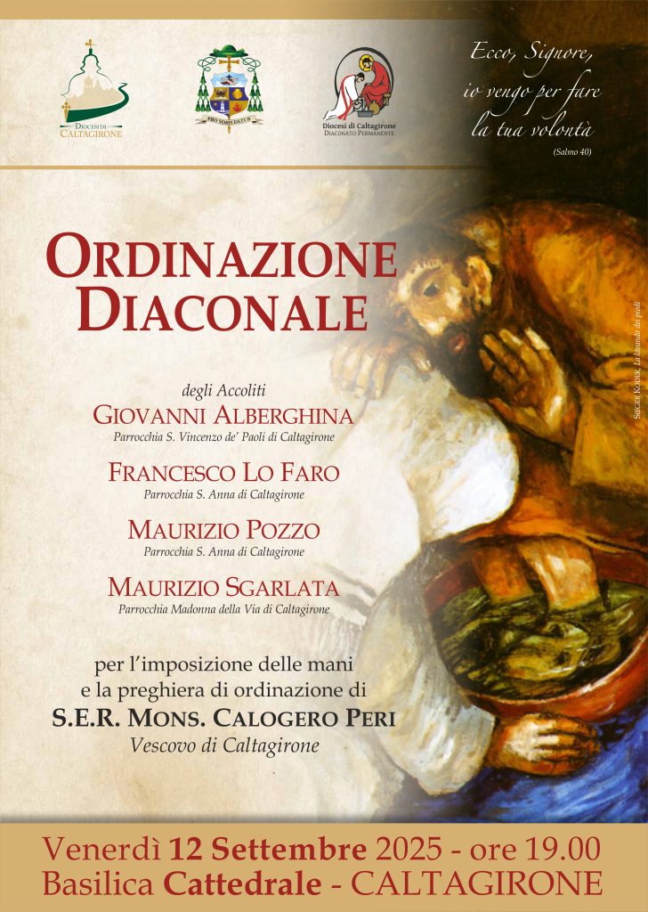 Quattro nuovi diaconi permanenti per la Chiesa calatina: l’ordinazione venerdì 12 settembre 2025 nella festa della fondazione della DiocesiQuattro nuovi diaconi permanenti per la Chiesa calatina: l’ordinazione venerdì 12 settembre 2025 nella festa della fondazione della Diocesi9 Settembre 2025