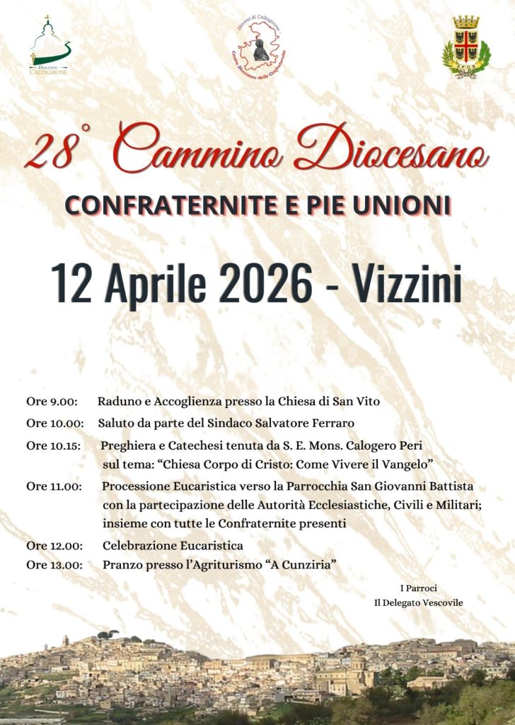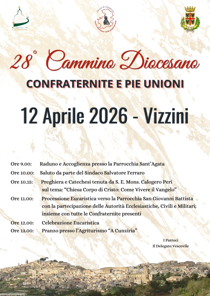 Nomina del VescovoNomina del Vescovo2 Aprile 2026Convocazione del Vicario generale per la Messa CrismaleConvocazione del Vicario generale per la Messa Crismale31 Marzo 2026Palazzo Vescovile, presentazione della Via Crucis frutto della collaborazione tra ideatori, maestranze e volontari, accompagnata dal volume con le meditazioni di mons. Calogero Peri e sostenuta dalla Fondazione Sicana e da SICILBANCA.Palazzo Vescovile, presentazione della Via Crucis frutto della collaborazione tra ideatori, maestranze e volontari, accompagnata dal volume con le meditazioni di mons. Calogero Peri e sostenuta dalla Fondazione Sicana e da SICILBANCA.30 Marzo 2026 Indicazioni Liturgiche per la Settimana Santa https://www.diocesidicaltagirone.it/wp-content/uploads/sites/2/2026/03/30/ULD-Settimana-Santa-2026.pdf ULD - Settimana Santa 2026… Disposizioni Aggiornamento Elenchi B-C_2026-2027 Si comunica che è possibile presentare le domande di aggiornamento e/o inserimento negli Elenchi B-C… La Chiesa di Caltagirone si ritrova in Cattedrale per rendere grazie a Dio per i sedici anni di ministero episcopale di Mons. Peri. CALTAGIRONE – La Chiesa di Caltagirone si ritrova in Cattedrale per rendere grazie a Dio per… Insediamento canonico di don Salvatore Gallo come nuovo parroco della Parrocchia di San Giacomo a Caltagirone Caltagirone – Giovedì 19 marzo alle ore 19.30, in occasione della festa di San Giuseppe,… XVI Anniversario Ordinazione Episcopale del Vescovo Prot. 1/26 Ai rev. Presbiteri, Diaconi, Religiosi e Religiose, alle… Solidarietà a Mons. Corrado Lorefice Condividiamo la Lettera della Consulta Regionale e Diocesana delle Aggregazioni Laicali che esprime solidarietà al… archivio newsJavascript Tab Notizie dalle Parrocchie Notizie dagli Uffici Notizie dalle Aggregazioni Laicali Insediamento canonico di don Salvatore Gallo come nuovo parroco della Parrocchia di San Giacomo a Caltagirone “Puer natus”, presentato a Mineo, dopo il restauro, il frammento di un Messale Gallicano del XII secolo. Mineo recupera la chiesa di Sant’Agrippina. Restaurati gli affreschi di Sebastiano Monaco Memoria Agrippinae Martyris: i luoghi, le reliquie e il culto della Patrona di Mineo fra archeologia e agiografia Mineo in festa per la riapertura della chiesa di S. Agrippina Indicazioni Liturgiche per la Settimana Santa Disposizioni Aggiornamento Elenchi B-C_2026-2027 Laboratorio Giovani, Musica e Liturgia XXXIV Giornata Mondiale del Malato L’insegnamento della religione cattolica: laboratorio di cultura e dialogo Mandato ai Ministri Straordinari della Comunione – lettera del Direttore Comunicazioni per il Laboratorio Giovani, Musica e Liturgia Giubileo dei Detenuti – Lettera di presentazione GMG diocesana 2025 Rosario per la pace in comunione con Papa Leone XIV e ricordando l’apertura del Concilio Vaticano II – 11 ottobre Solidarietà a Mons. Corrado Lorefice Caltagirone celebra i 100(+2) anni di Scoutismo La Diocesi Calatina celebra il Corpus Domini e il Giubileo delle Aggregazioni Laicali e delle Confraternite. L’Azione Cattolica “entra in azione” per la Festa della Pace Cammino Diocesano delle Confraternite Dieci anni di Serra in Diocesi III Cammino Regionale delle Confraternite di Sicilia Una ceramica calatina per papa Francesco. L’Azione Cattolica Diocesana celebra l’annuale Festa dell’Adesione ai piedi di Maria La Diocesi di Caltagirone e il Centro di Aiuto alla vita riflettono su Libertà e Vita. Link Utili PHOTOGALLERY XVI Anniversario di Ordinazione Episcopale di Mons. Calogero Peri Ritiro Giovanissimi e Giovani – Raddusa, 1 marzo 2026 VIDEO Questo contenuto non è disponibile per via delle tue preferenze sui cookieQuesto contenuto non è disponibile per via delle tue preferenze sui cookie Prossimi eventiCammino Diocesano delle ConfraterniteMessa del CrismaPresentazione nuova Via CrucisInizio Ministero di Parroco di don Salvatore GalloXVI Anniversario di Consacrazione Episcopale del vescovoCappella Musicale in ConcertoFormazione IdRCReferendum sulla giustiziaRitiro di Quaresima per Giovani e GiovanissimiFesta degli Innamorati