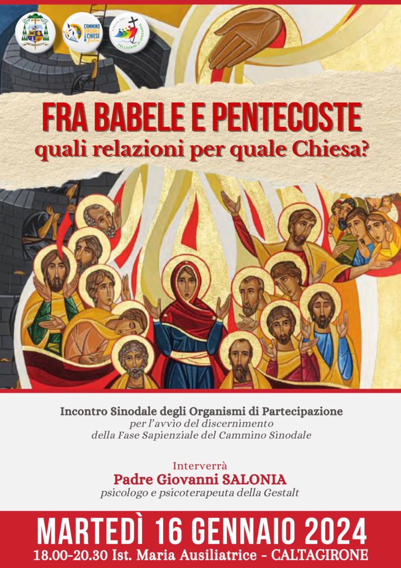 In questa prossima tappa, che avvia il discernimento degli organismi di partecipazione e che abbiamo voluto intitolare con uno slogan “Fra Babele e Pentecoste: quali relazioni per quale Chiesa?” ci aiuterà a riflettere padre Giovanni Salonia, psicologo e psicoterapeuta della Gestalt, direttore e responsabile scientifico della Scuola di Specializzazione in terapia della Gestalt.