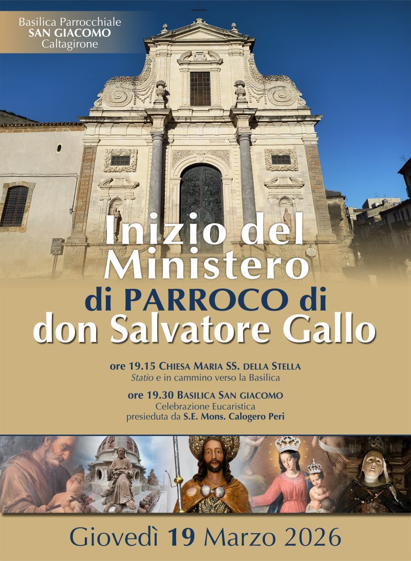 Caltagirone – Giovedì 19 marzo alle ore 19.30, in occasione della festa di San Giuseppe, si terrà l’insediamento canonico di don Salvatore Gallo come nuovo parroco della Parrocchia di San Giacomo.