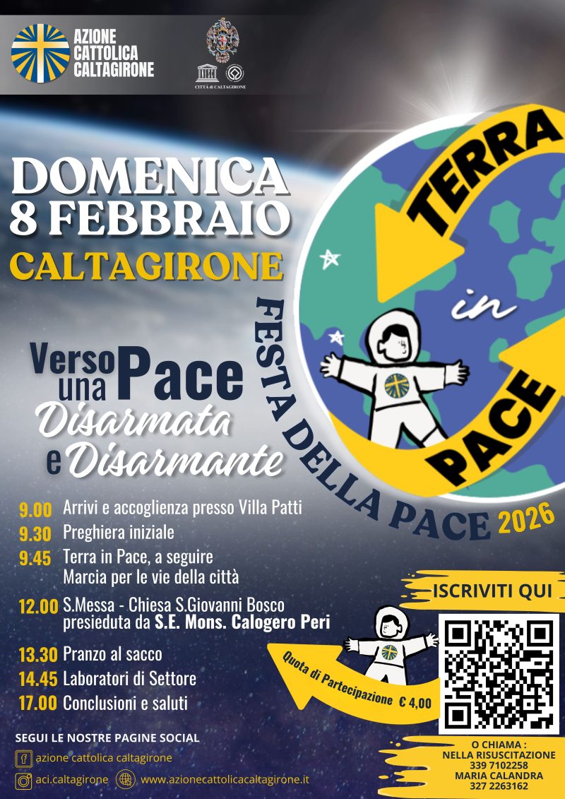 Domenica 8 febbraio 2026, la città di Caltagirone ospiterà la Festa della Pace, un appuntamento organizzato dall’Azione Cattolica della diocesi di Caltagirone, che vedrà la partecipazione di gruppi parrocchiali provenienti dai vari paesi e che avrà come slogan “Terra in pace: verso una pace disarmata e disarmante!”.