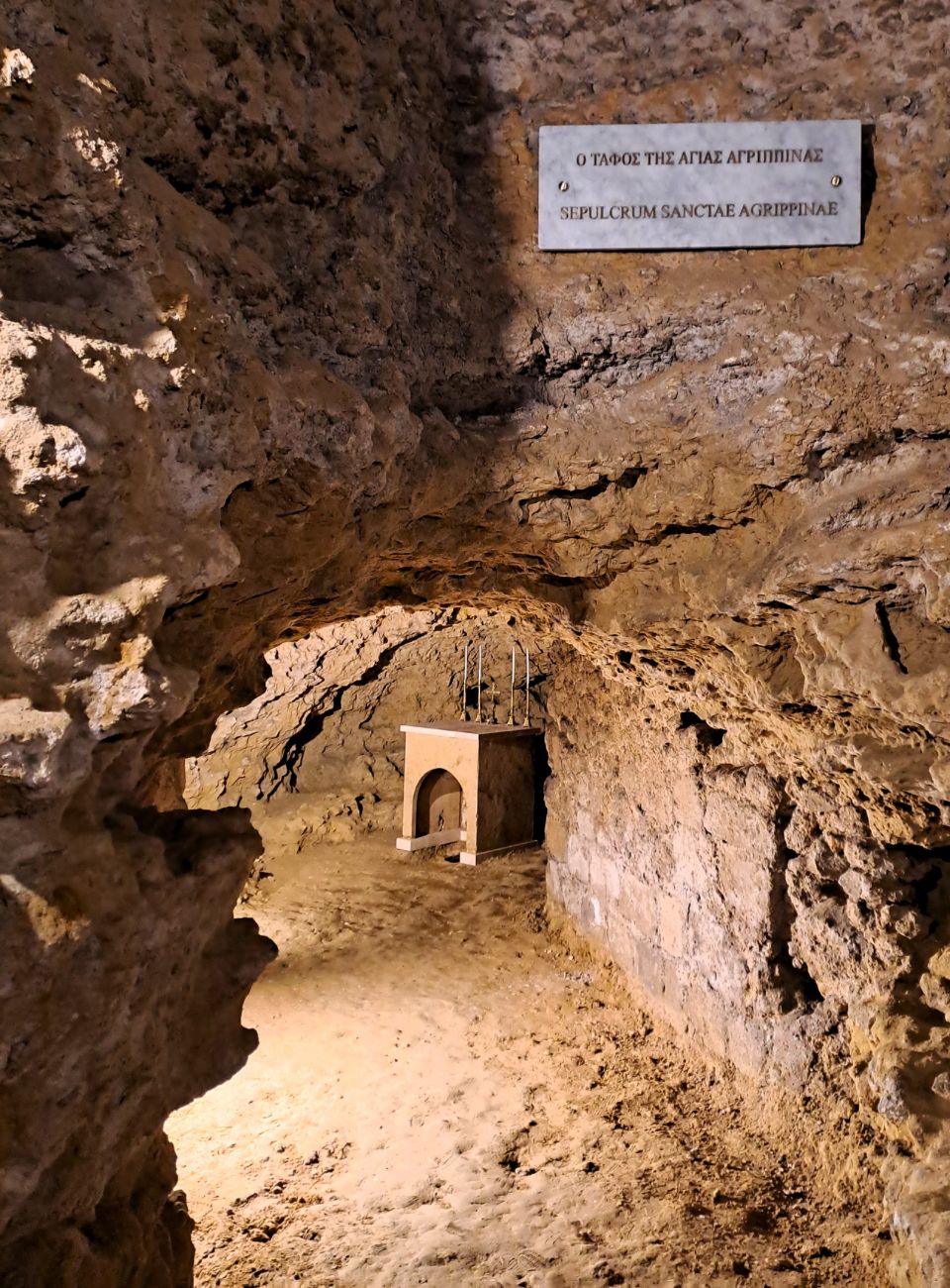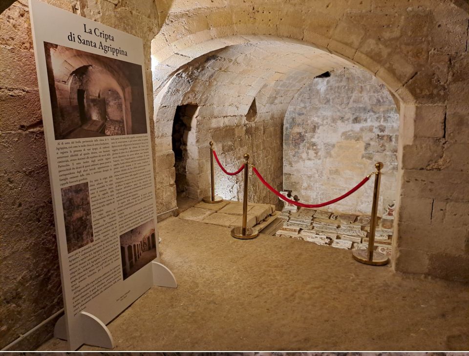 Il vasto ambiente ipogeo della cripta, che si estende sotto il livello pavimentale della chiesa di Santa Agrippina, come testimonia uno scalone monumentale in stile gotico-catalano, nel corso dei secoli è stato sempre frequentato dai fedeli al fine di estrarvi la “creta”, cioè il terriccio ritenuto miracoloso per il contatto con le reliquie della martire Agrippina, ancora oggi richiesto e utilizzato come rimedio taumaturgico contro le tempeste, le malattie e le calamità naturali.