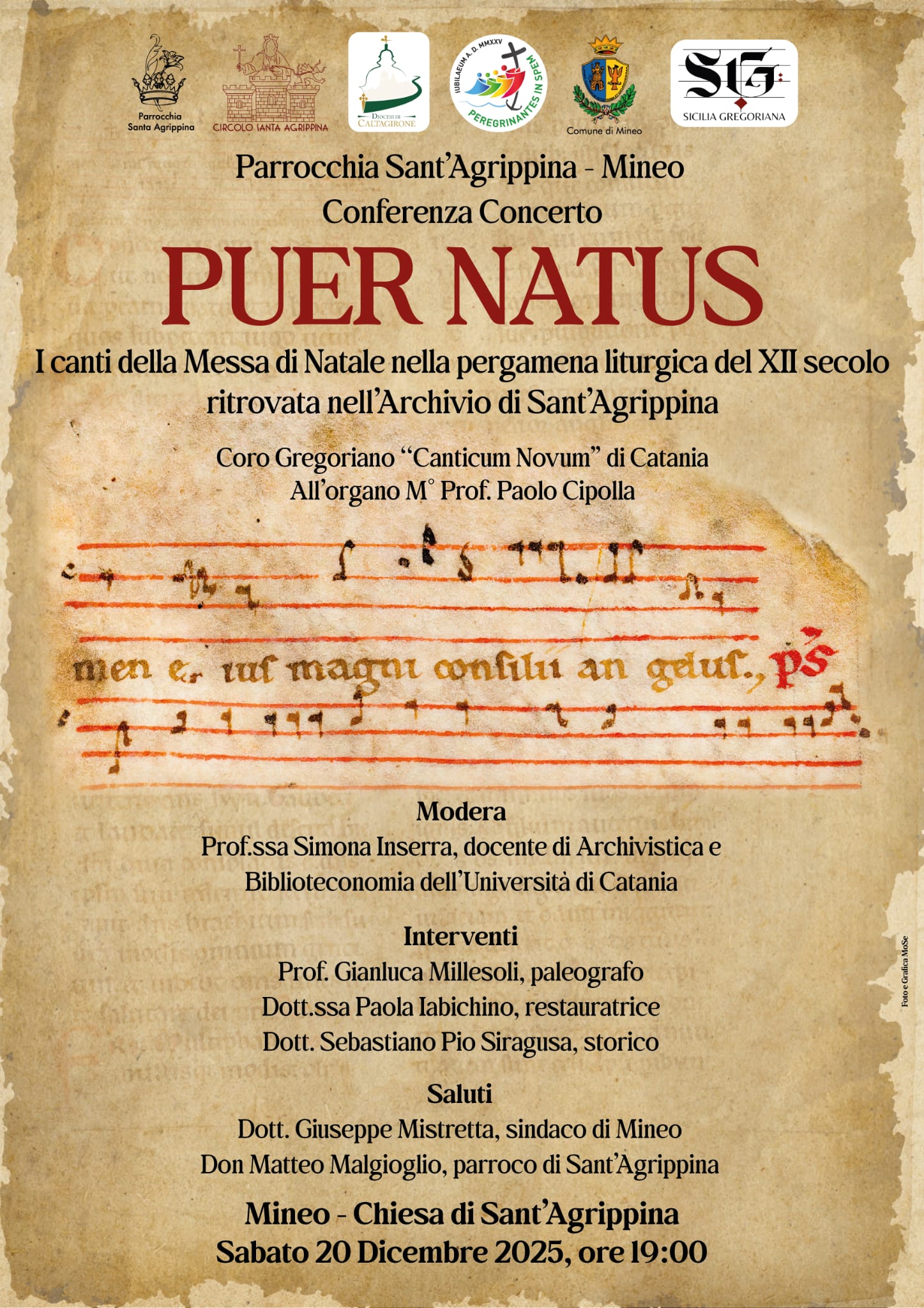 Si è svolta sabato 20 dicembre, presso la chiesa di Santa Agrippina a Mineo, la conferenza-concerto “Puer Natus”, nella quale è stato presentato al pubblico, a seguito del restauro, il frammento membranaceo di un Messale Gallicano (Normanno-Siculo) del XII secolo, recentemente scoperto presso l’archivio storico della stessa Parrocchia e contenente i testi liturgici della Messa del giorno di Natale, con l’inserzione di partiture musicali gregoriane.