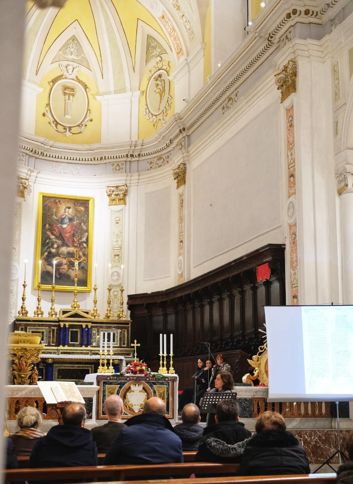 L’evento culturale, inserito nel calendario di eventi natalizi della Parrocchia Santa Agrippina, ha visto la partecipazione di docenti e di esperti di archivistica, paleografia, di tecnica del restauro e di storia locale. La professoressa Simona Inserra, docente di archivistica e biblioteconomia presso l’Università di Catania, ha evidenziato l’importanza dello studio dei frammenti dei libri manoscritti, sopravvissuti grazie al riutilizzo del materiale di cui erano fatti, per comprendere meglio fenomeni quali la produzione e la circolazione dei libri e dei testi. Il professore Gianluca Millesoli, paleografo, attraverso una minuziosa analisi delle caratteristiche tecniche, calligrafiche e testuali, ha ricostruito a grandi linee la genesi del frammento, appartenuto a un Messale Gallicano (secondo il rito romano-gallicano introdotto in Sicilia dai Normanni), databile all’ultimo quarto del XII secolo e prodotto in uno scriptorium sicuramente siciliano, anche se non fra i principali. La dottoressa Paola Iabichino, restauratrice, ha invece descritto le fasi più importanti dell’intervento di restauro, che ha permesso di migliorare lo stato di salute del frammento e i suoi dispositivi di fruizione da parte degli studiosi. Infine, il dottor Sebastiano Siragusa ha delineato la vicenda biografica di don Girolamo Ballirò, beneficiato ed economo di Santa Agrippina, al quale si deve la rilegatura del quaderno con il foglio di pergamena, probabilmente recuperato fra i libri dismessi della stessa chiesa nel momento in cui, dopo il Concilio di Trento, in Sicilia cominciò ad essere introdotto il Messale Romano. Il dott. Siragusa ha inoltre descritto le caratteristiche del registro, le cui pagine lasciate in bianco da Ballirò furono riutilizzate dai canonici di Santa Agrippina nei primi anni del ’700, garantendone così la conservazione fino ai nostri giorni.